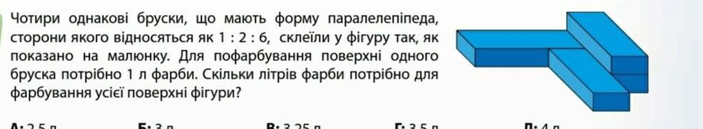 Оскільки на фарбування одного бруска затрачається 1 л фарби, а бруски склеїли так, що не потрібно буде фарбувати по дві грані різної площі, тобто один повноцінний брусок. Отже витратити потрібно 3 л фарби