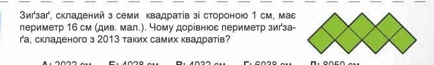 Зигзаг, составлен из семи квадратов со стороной 1 см, имеет периметр 16 см (см. рис.). Чему равен периметр зигзага, составленного из 2013 таких самих квадратов?