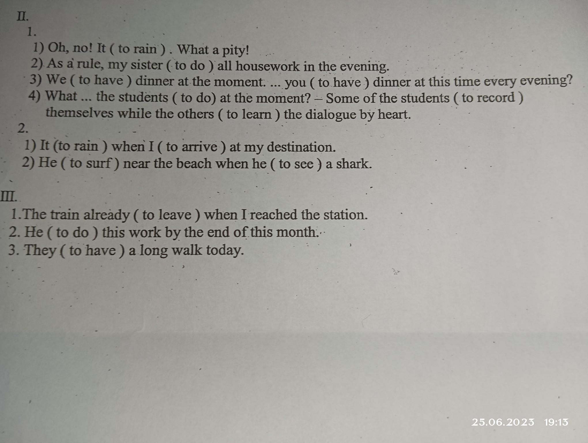 |||. Відкрити дужки. Поставити дієслова у теперішньому, минулому або майбутньому перфектному часі. Записати дані речення у заперечній та запитальній формі.