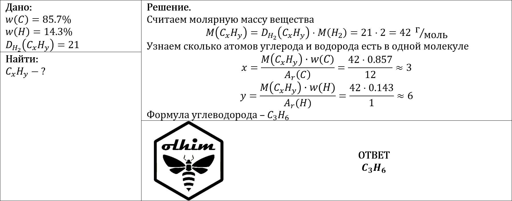 Выведите молекулярную формулу вещества содержащего 85,7% углерода и 14,3% водорода плотность паров по водорода равна 21