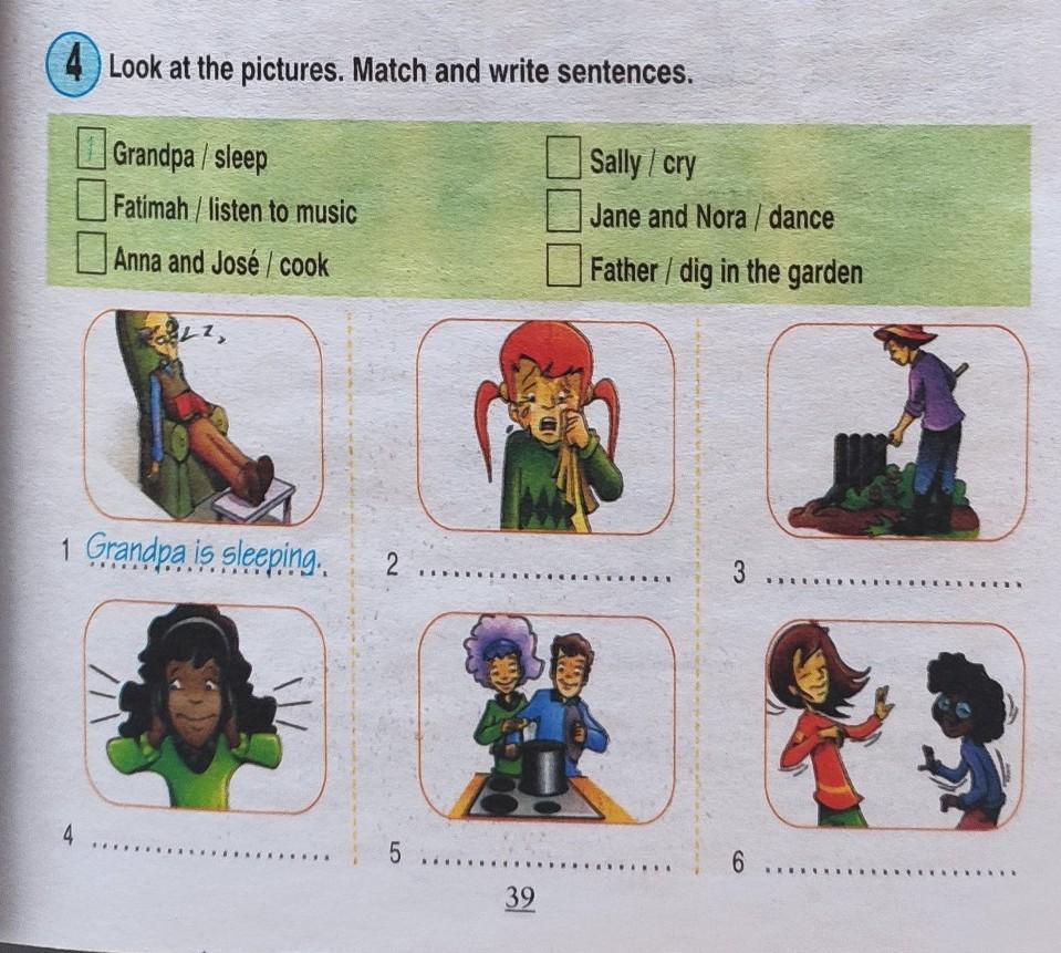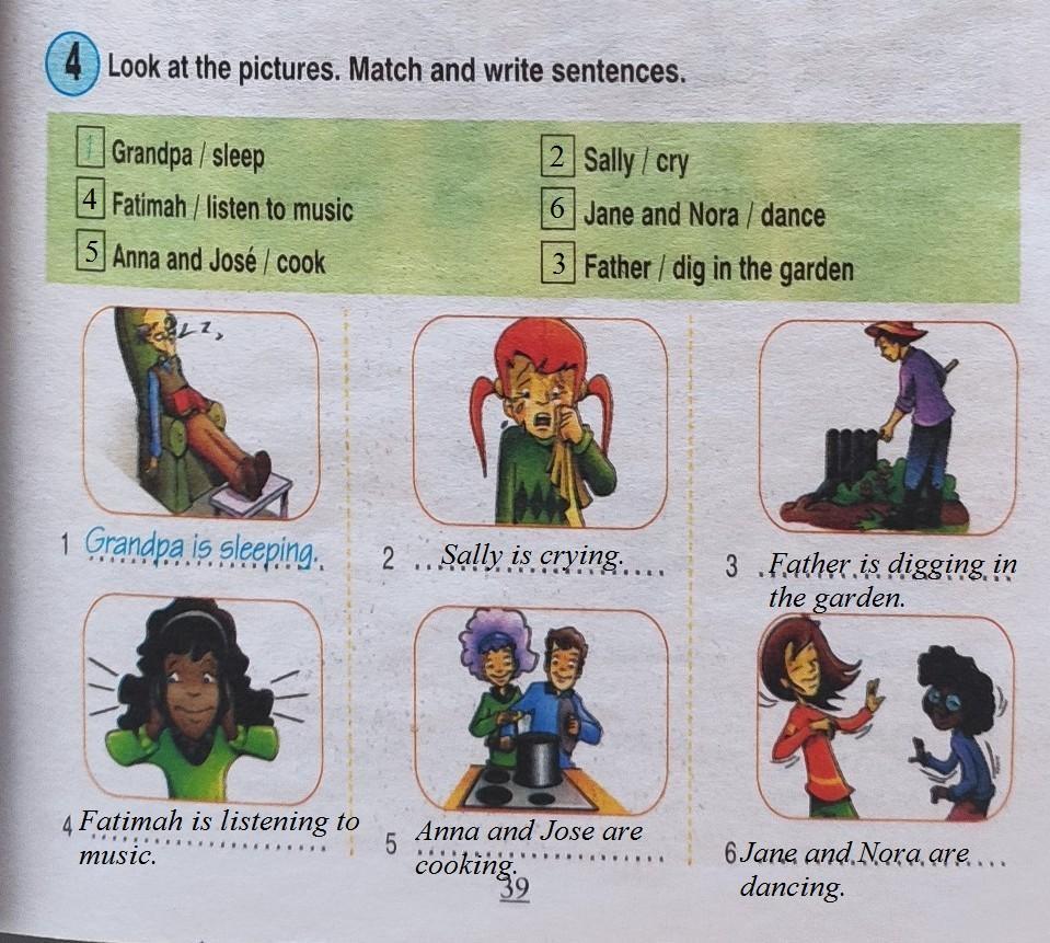 is crying. 3. Father is digging in the garden. 4. Fatimah is listening to music. 5. Anna and Jose are cooking. 6. Jane and Nora are dancing.