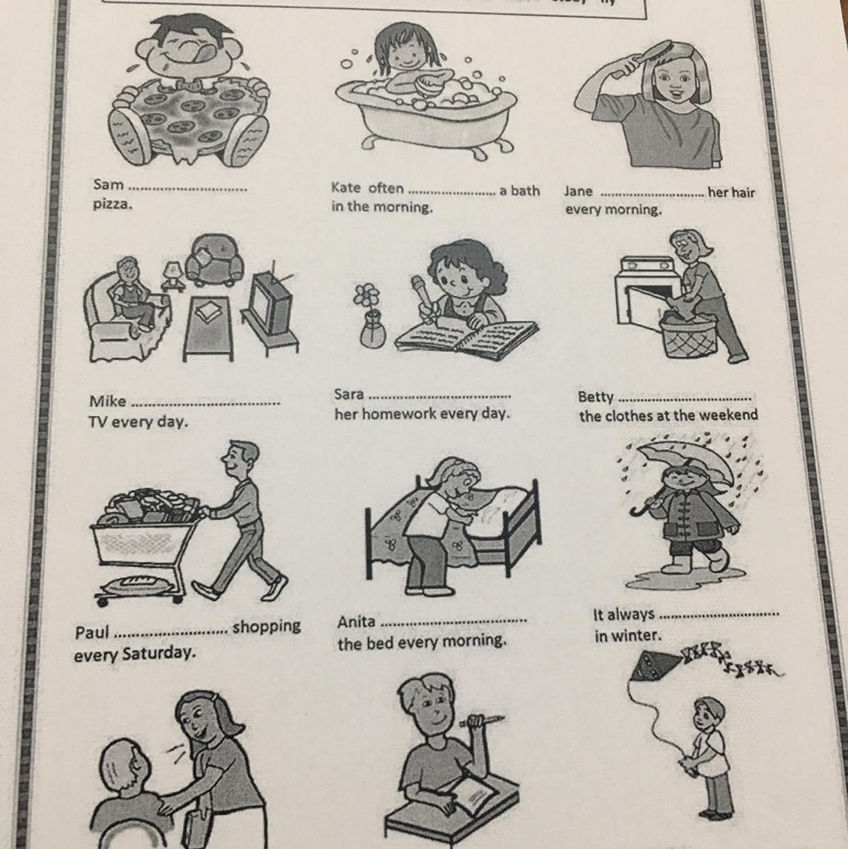 Look at the pictures and complete each sentence with a verb from the box.