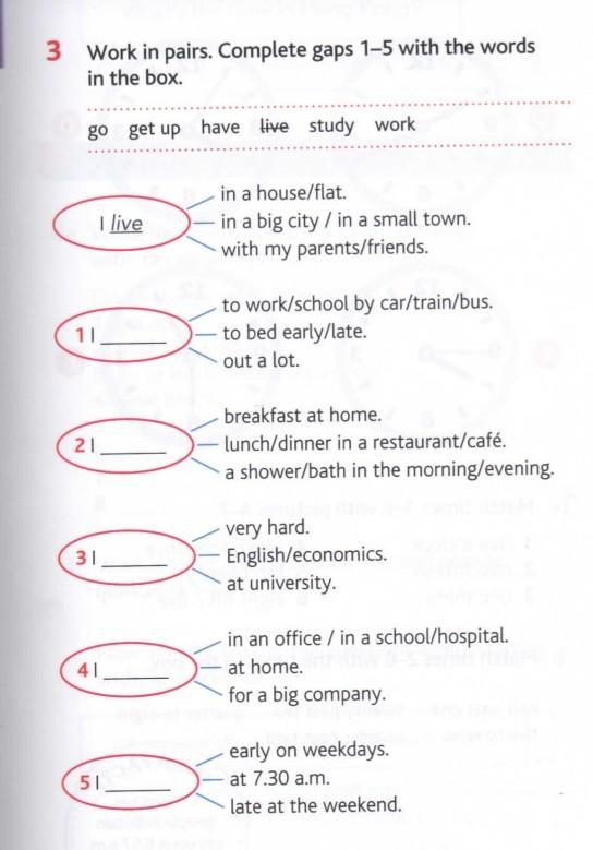 3 Work in pairs. Complete gaps 1-5 with the words in the box. go get up have live study work 11 21 I live 31, 41. 51 in a house/flat. in a big city / in a small town. with my parents/friends. to work/school by car/train/bus. to bed early/late. out a lot. breakfast at home. lunch/dinner in a restaurant/café. a shower/bath in the morning/evening. very hard. English/economics. at university. in an office / in a school/hospital. at home. for a big company. early on weekdays. at 7.30 a.m. late at the weekend.