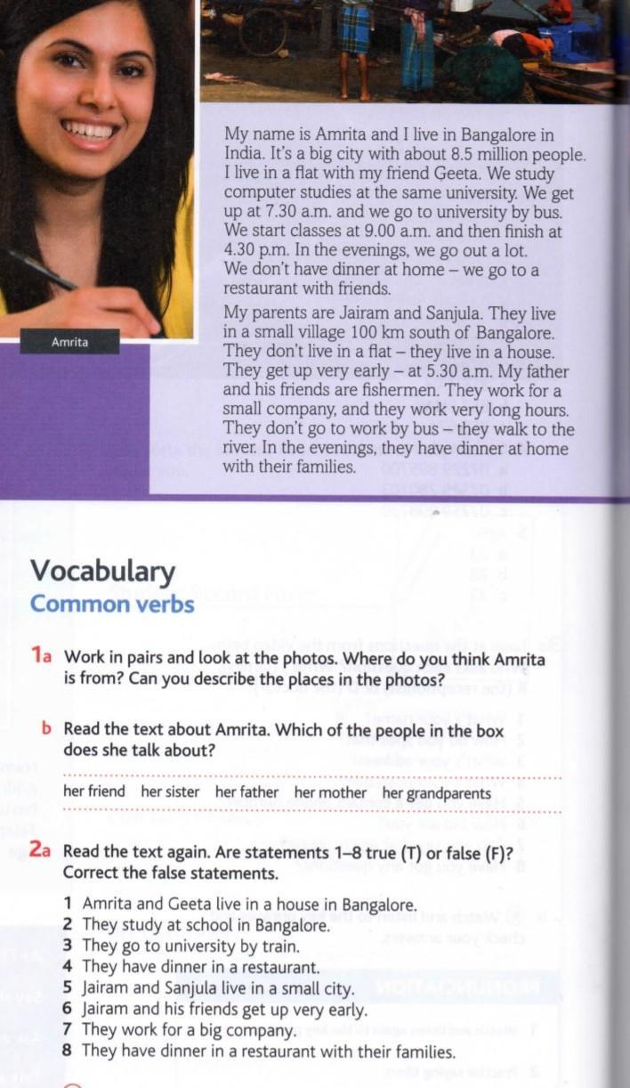 Amrita Vocabulary Common verbs My name is Amrita and I live in Bangalore in India. It's a big city with about 8.5 million people. I live in a flat with my friend Geeta. We study computer studies at the same university. We get up at 7.30 a.m. and we go to university by bus. We start classes at 9.00 a.m. and then finish at 4.30 p.m. In the evenings, we go out a lot. We don't have dinner at home - we go to a restaurant with friends. My parents are Jairam and Sanjula. They live in a small village 100 km south of Bangalore. They don't live in a flat- they live in a house. They get up very early - at 5.30 a.m. My father and his friends are fishermen. They work for a small company, and they work very long hours. They don't go to work by bus- they walk to the river. In the evenings, they have dinner at home with their families. 1a Work in pairs and look at the photos. Where do you think Amrita is from? Can you describe the places in the photos? b Read the text about Amrita. Which of the people in the box does she talk about? her friend her sister her father her mother her grandparents 2a Read the text again. Are statem 1-8 true (T) or false (F)? Correct the false statements. 1 Amrita and Geeta live in a house in Bangalore. 2 They study at school in Bangalore. 3 They go to university by train. 4 They have dinner in a restaurant. 5 Jairam and Sanjula live in a small city. 6 Jairam and his friends get up very early. 7 They work for a big company. 8 They have dinner in a restaurant with their families.