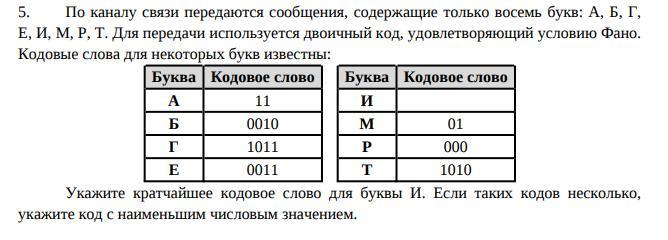 Е, И, М, Р, Т. Для передачи используется двоичный код, удовлетворяющий условию Фано. Кодовые слова для некоторых букв известны: