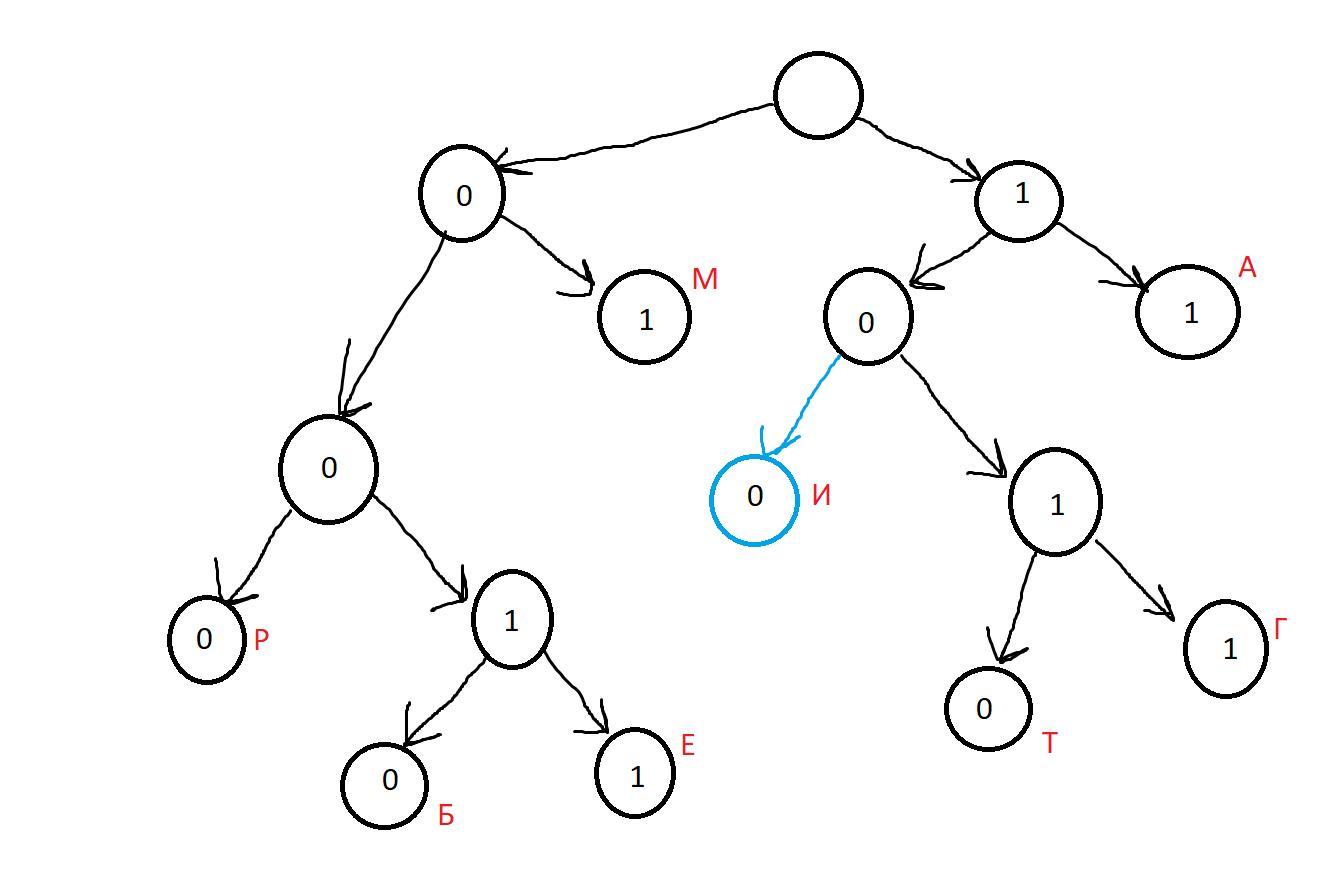 Для того, чтобы решить данную задачу, необходимо построить бинарное дерево, где корень у правого поддерева имеет значение 1, а корень у левого - 0. После того, как оно построилось, можно заметить, что только из одной вершины возможно только провести ещё одну вершину для буквы И (она обозначена синим цветом). И идя из корня дерева к листу, получается последовательность: 1-0-0=>100