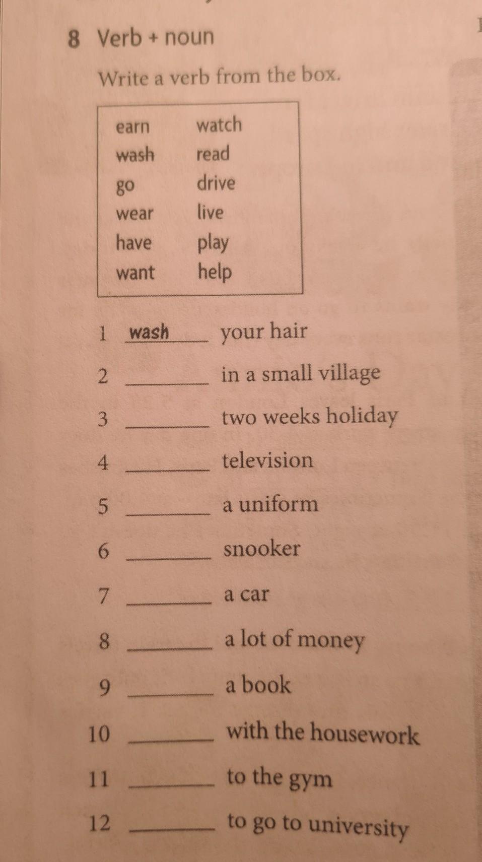 8 Verb + noun Write a verb from the box. 2 1 wash 3 4 in N 5 6 7 8 9 earn wash 10 11 12 go wear have want watch read drive live play help ||| your hair in a small village two weeks holiday television a uniform snooker a car a lot of money a book with the housework to the gym to go to university