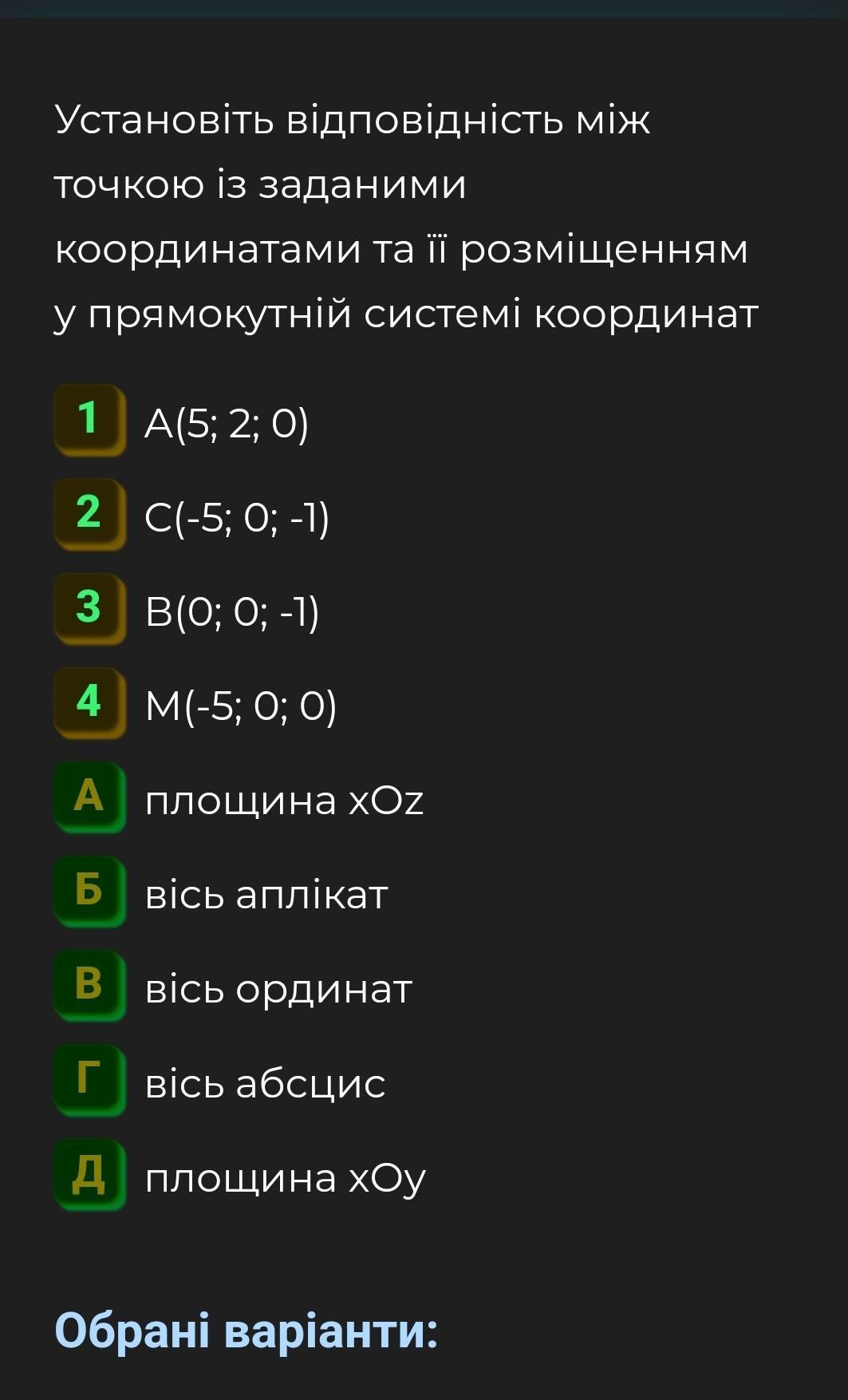 установіть відповідність між точкою із заданими координатами та її розміщенням у прямокутній системі координат