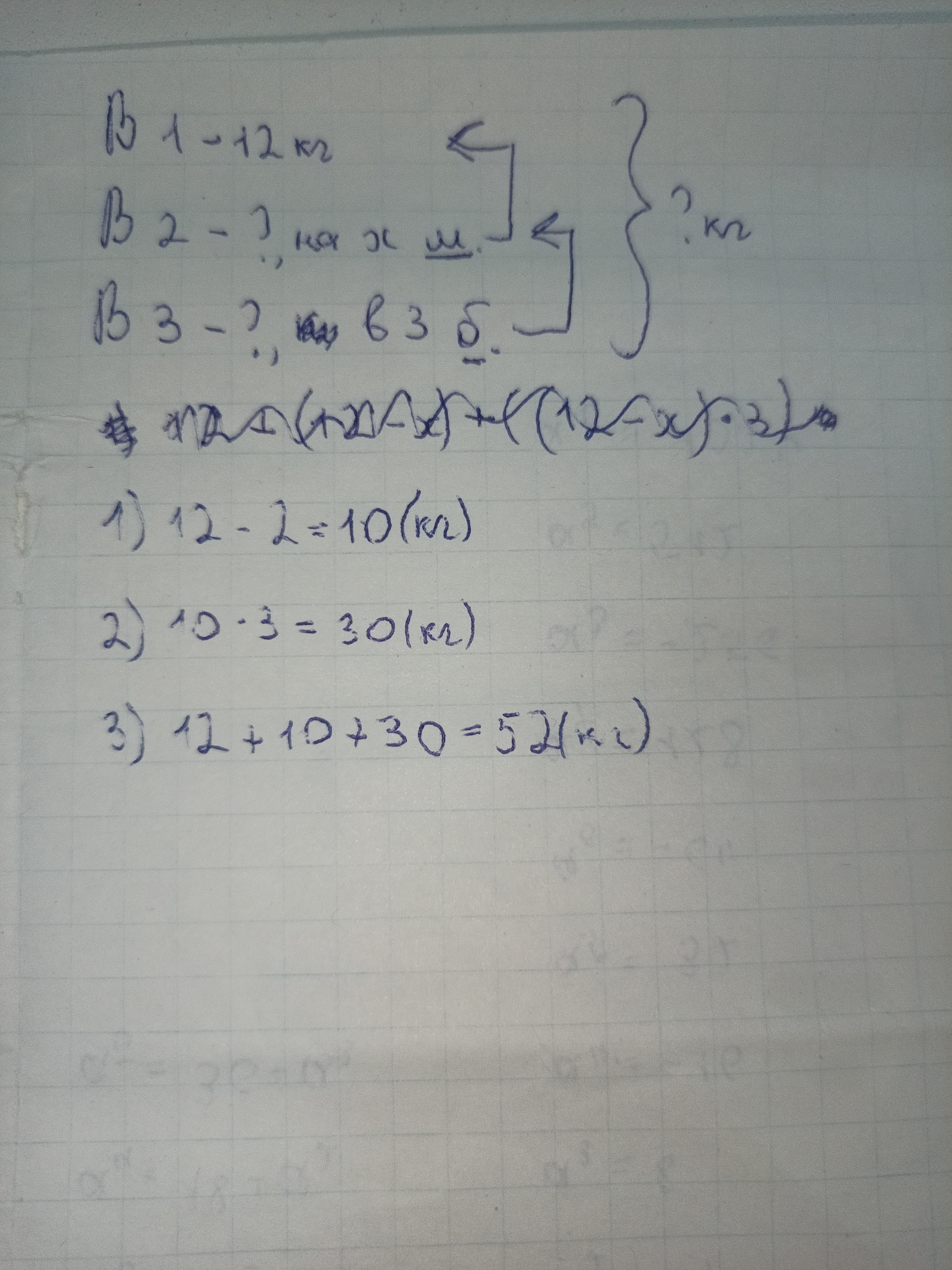В одному ящику 12 кг винограду, у другому на x кг менше, ніж у першому, а у третьому утричі більше ніж у другому. Скільки кг винограду у трьох ящиках разом? Складіть буквений вираз і знайдіть його значення, якщо x = 2.