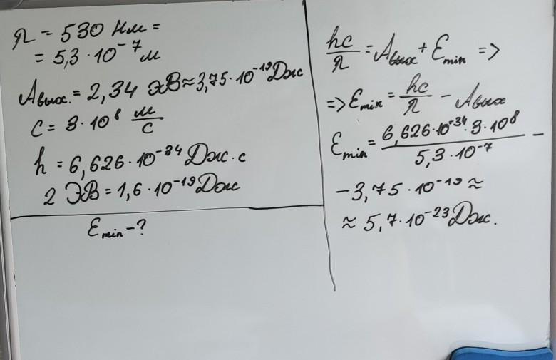определите минимальную кинетическую энергию фотоэлектронов вылетающих из натрия при его освещение лучами длинной волны 530 нм. Работа выхода электронов из натрия 2,34эВ(с=3*10^8м/с, h=6,626*10^-34 дж*с,2 ЭВ =1,6*10^-19Дж)