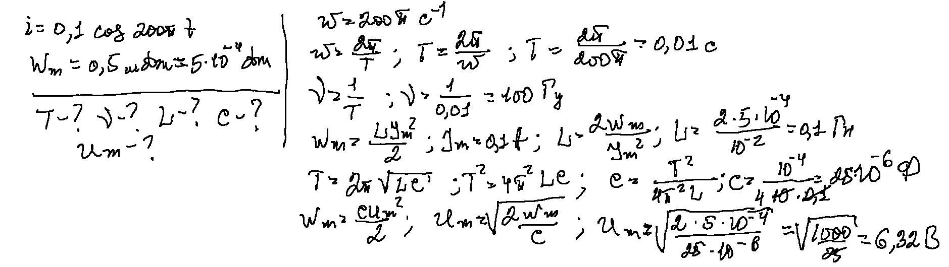 Сила тока в колебательном контуре изменяется по закону: I=0,1cos200pit, А. Максимальная энергия электромагнитного поля колебательного контура 0,5 мДж. Определите период колебаний, частоту колебаний, индуктивность, емкость конденсатора и максимальное напряжение.