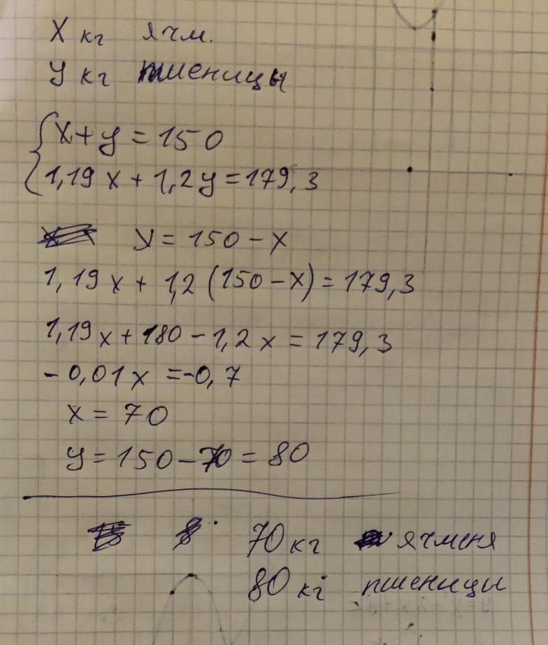 ежедневно птицам давали 150 кг ячменя и пшеницы после увеличения ячменя в 19% и пшеницы в 20% ежедневно птицам давали 179,3 кг корма сколько ячменя и сколько пшеницы в день давали птицам ежедневно изначально