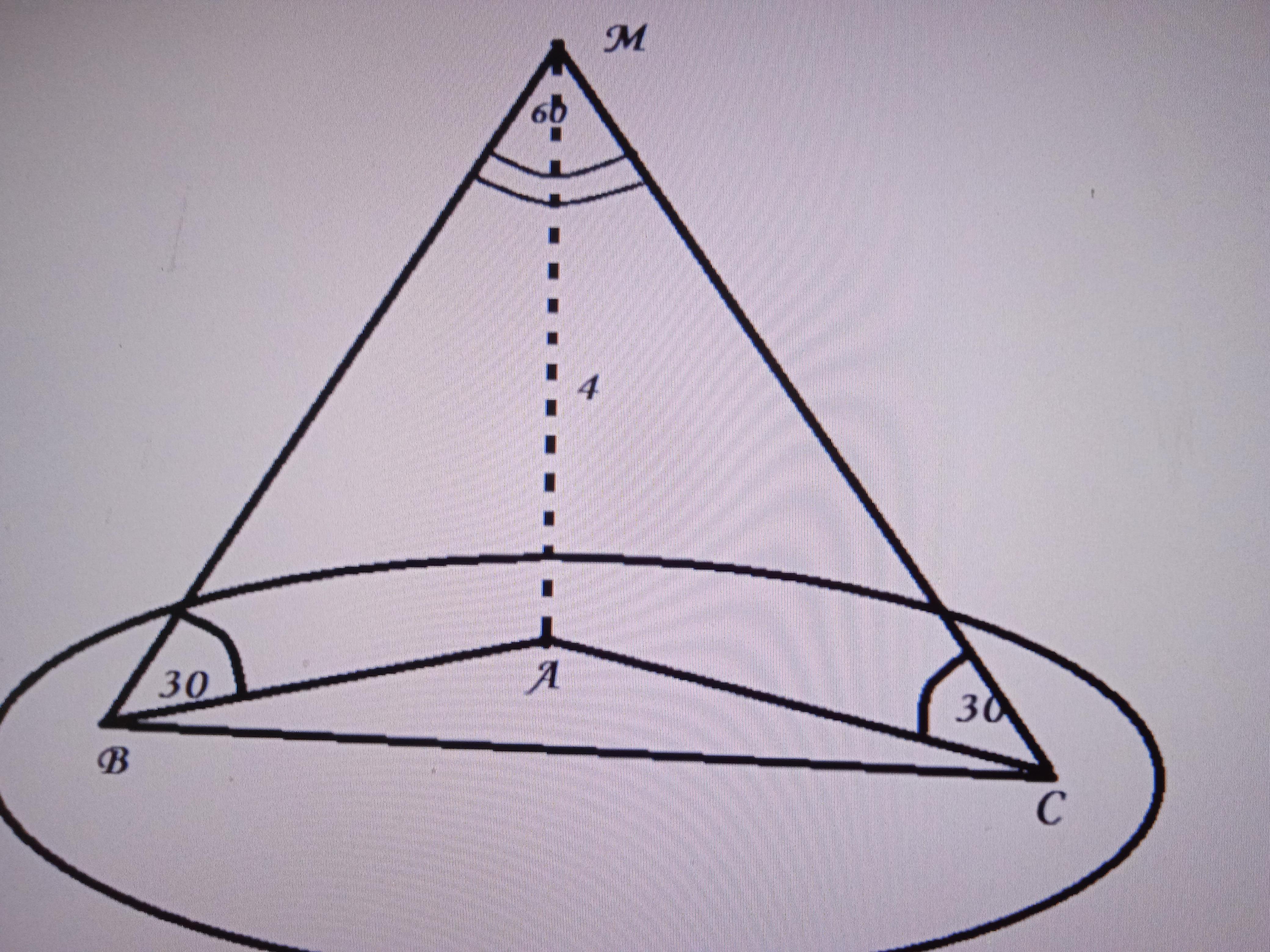 Дано: ВМ и СМ - наклонные, АМ⊥плоскости α; АМ=4 см. ∠МВА=∠МСА=30°. ВС-?