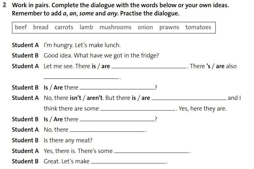 2 Work in pairs. Complete the dialogue with the words below or your own ideas. Remember to add a, an, some and any. Practise the dialogue. beef bread carrots lamb mushrooms onion prawns tomatoes Student A I'm hungry. Let's make lunch. Student B Good idea. What have we got in the fridge? Student A Let me see. There is/are. Student B Is / Are there Student A Student B Student A Student B Student A Student B No, there isn't / aren't. But there is/are think there are some. Is / Are there. No, there. Is there any meat? Yes, there is. There's some. Great. Let's make. ? There's / are also Yes, here they are. and I