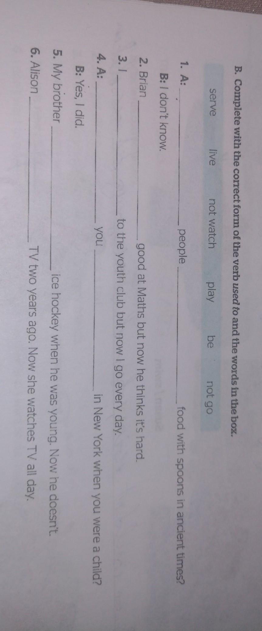 B. Complete with the correct form of the verb used to and the words in the box. 1. A: serve B: I don't know. 2. Brian 3.1 4. A: live B: Yes, I did. 5. My brother 6. Alison not watch people play be not go food with spoons in ancient times? good at Maths but now he thinks it's hard. to the youth club but now I go every day. you in New York when you were a child? ice hockey when he was young. Now he doesn't. TV two years ago. Now she watches TV all day. дам 100 баллов