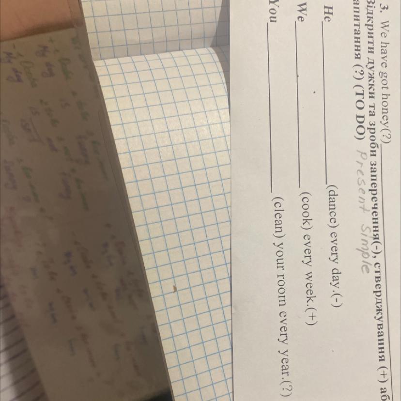 1. He doesn't dance every day. 2. We cook every week. 3. Do you clean your room every year?