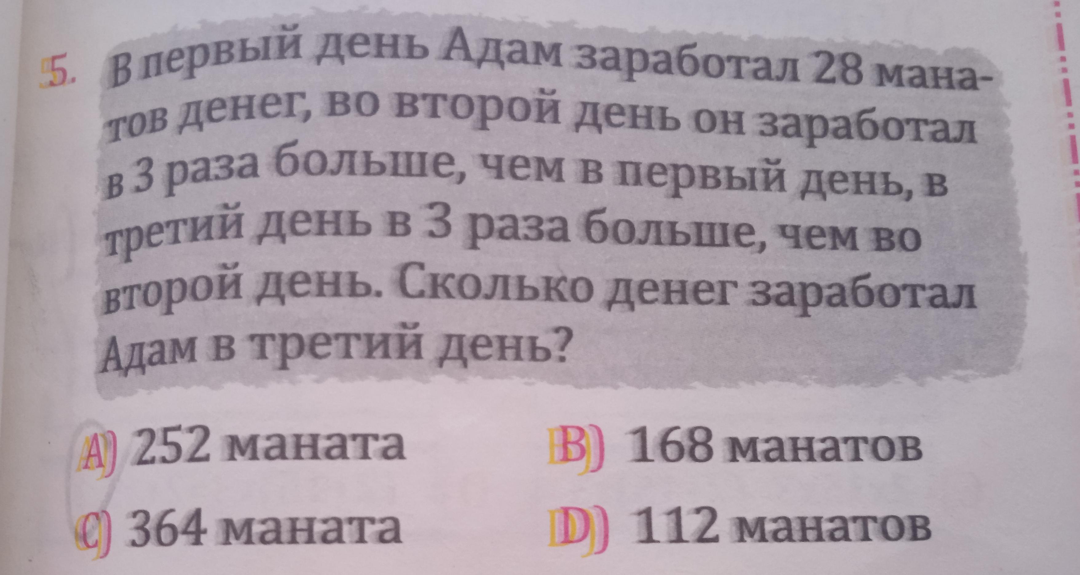 1) 28 * 3 = 84 (ман.) - заработал во второй день