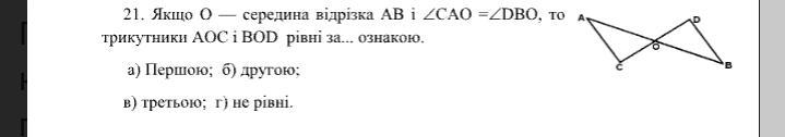 Якщо O- середина відрізка AB і кута CAO- кут DBO, то трикутники АОС і BOD рівні за.... Ознакою.