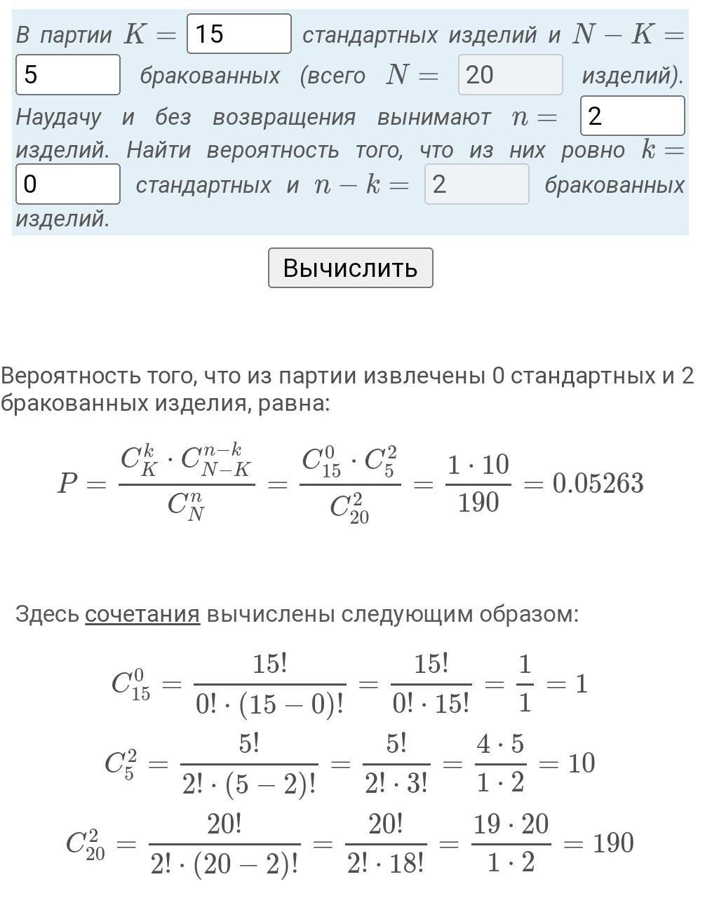 В мастерской 20 видов материалов. 5 из этих материалов являются бракованными. Найти вероятность того, что 2 случайно выбранных материала будут бракованными.