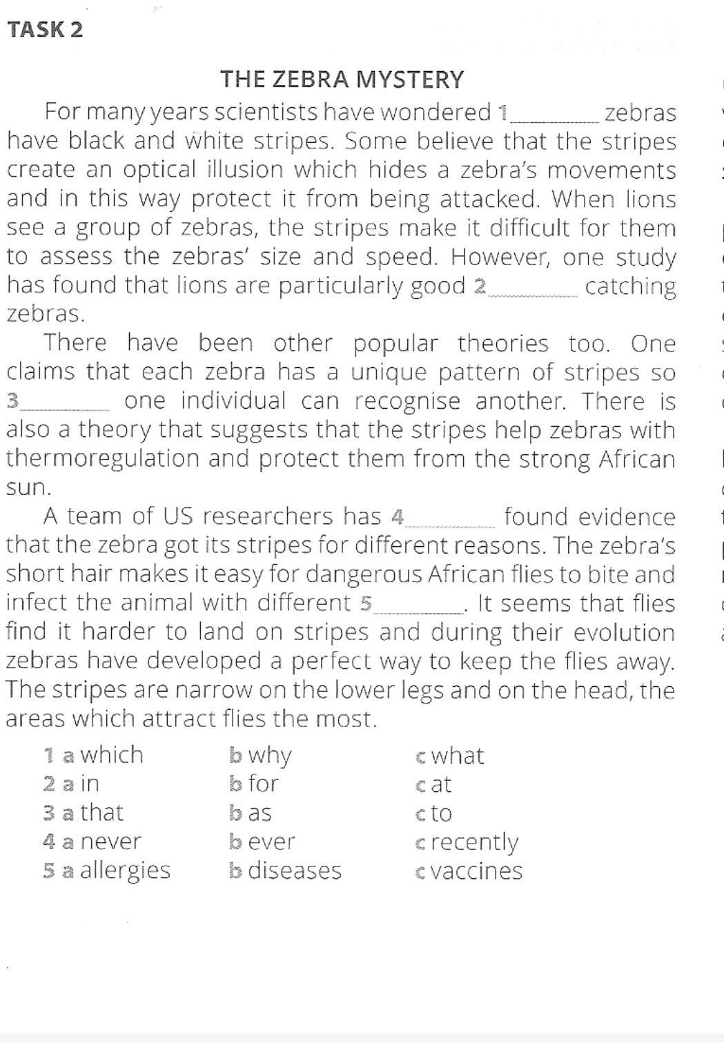 TASK 2 THE ZEBRA MYSTERY zebras For many years scientists have wondered 1. have black and white stripes. Some believe that the stripes create an optical illusion which hides a zebra's movements and in this way protect it from being attacked. When lions see a group of zebras, the stripes make it difficult for them to assess the zebras' size and speed. However, one study has found that lions are particularly good 2 catching zebras. There have been other popular theories too. One claims that each zebra has a unique pattern of stripes so 3 one individual can recognise another. There is also a theory that suggests that the stripes help zebras with thermoregulation and protect them from the strong African sun. A team of US researchers has 4 found evidence that the zebra got its stripes for different reasons. The zebra's short hair makes it easy for dangerous African flies to bite and infect the animal with different 5 It seems that flies find it harder to land on stripes and during their evolution zebras have developed a perfect way to keep the flies away. The stripes are narrow on the lower legs and on the head, the areas which attract flies the most. 1 a which 2 a in 3 a that 4 a never 5 a allergies b why b for bas b ever b diseases