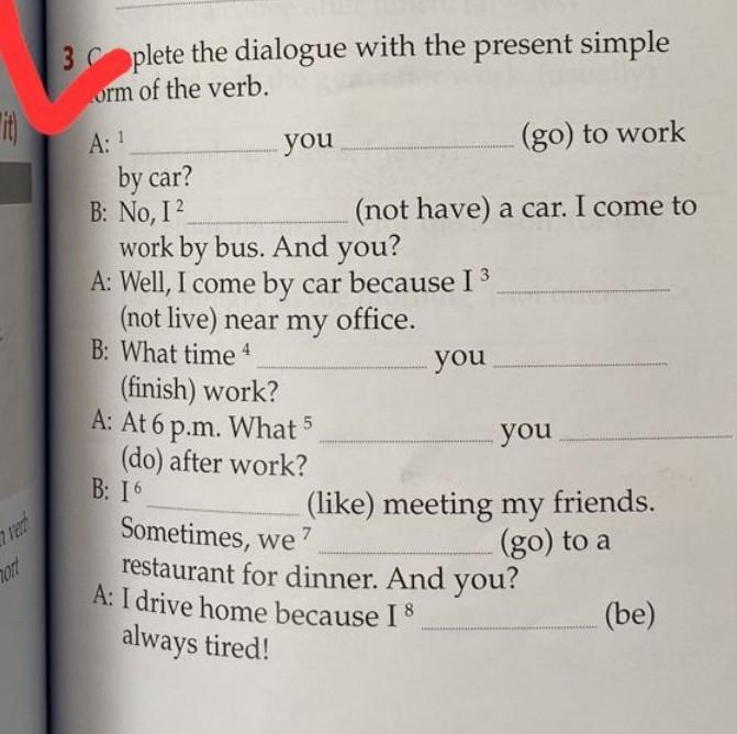 3 Complete the dialogue with the present simple V form of the verb. A: 1 by car? B: No, I 2. you work by bus. And you? A: Well, I come by car because I ³ (not live) near my office. B: What time 4 (finish) work? A: At 6 p.m. What 5 (do) after work? B: 16 (go) to work (not have) a car. I come to you you (like) meeting my friends. (go) to a (be) Sometimes, we restaurant for dinner. And you? A: I drive home because I 8 always tired!