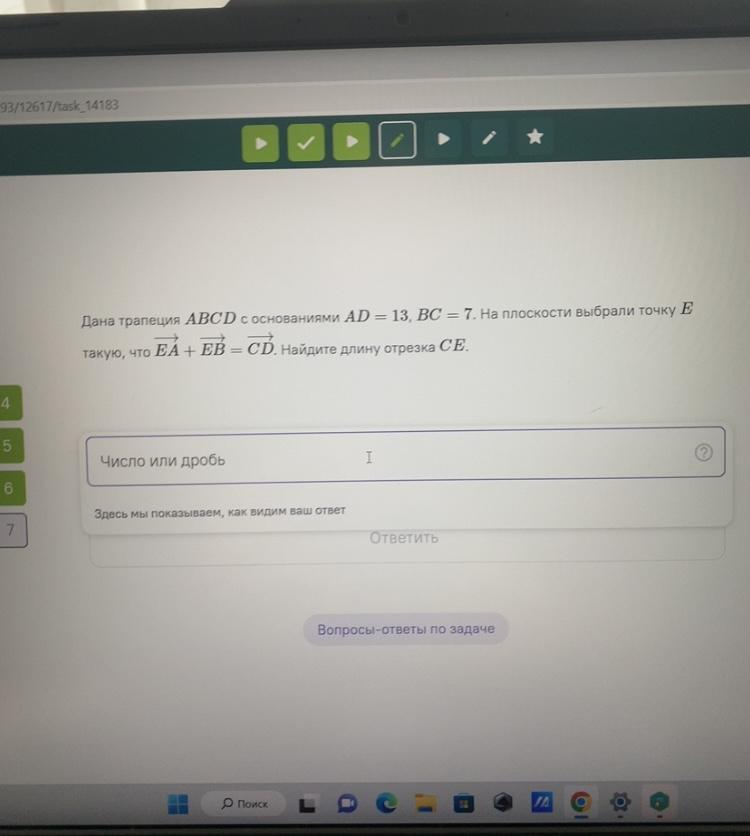 дана трапеция abcd с основаниями ad = 13, bc = 7. на плоскости выбрали точку e такую, что eà + ев = сб. найдите длину отрезка се.