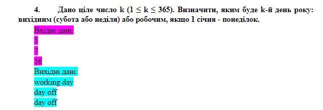 print('day off' if (int(input())+1)%7<2 else 'working day')