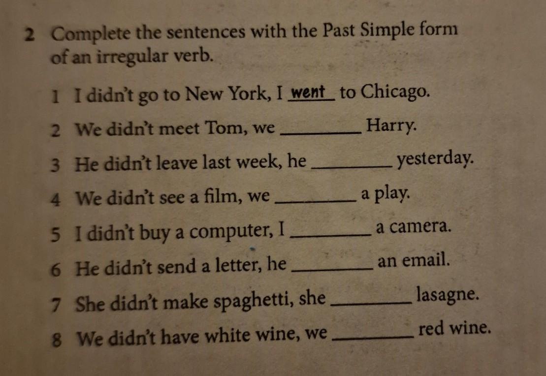 2 Complete the sentences with the Past Simple form of an irregular verb. 1 I didn't go to New York, I went to Chicago. 2 We didn't meet Tom, we Harry. 3 He didn't leave last week, he 4 We didn't see a film, we 5 I didn't buy a computer, I 6 He didn't send a letter, he 7 She didn't make spaghetti, she 8 We didn't have white wine, we yesterday. a play. a camera. an email. lasagne. red wine.