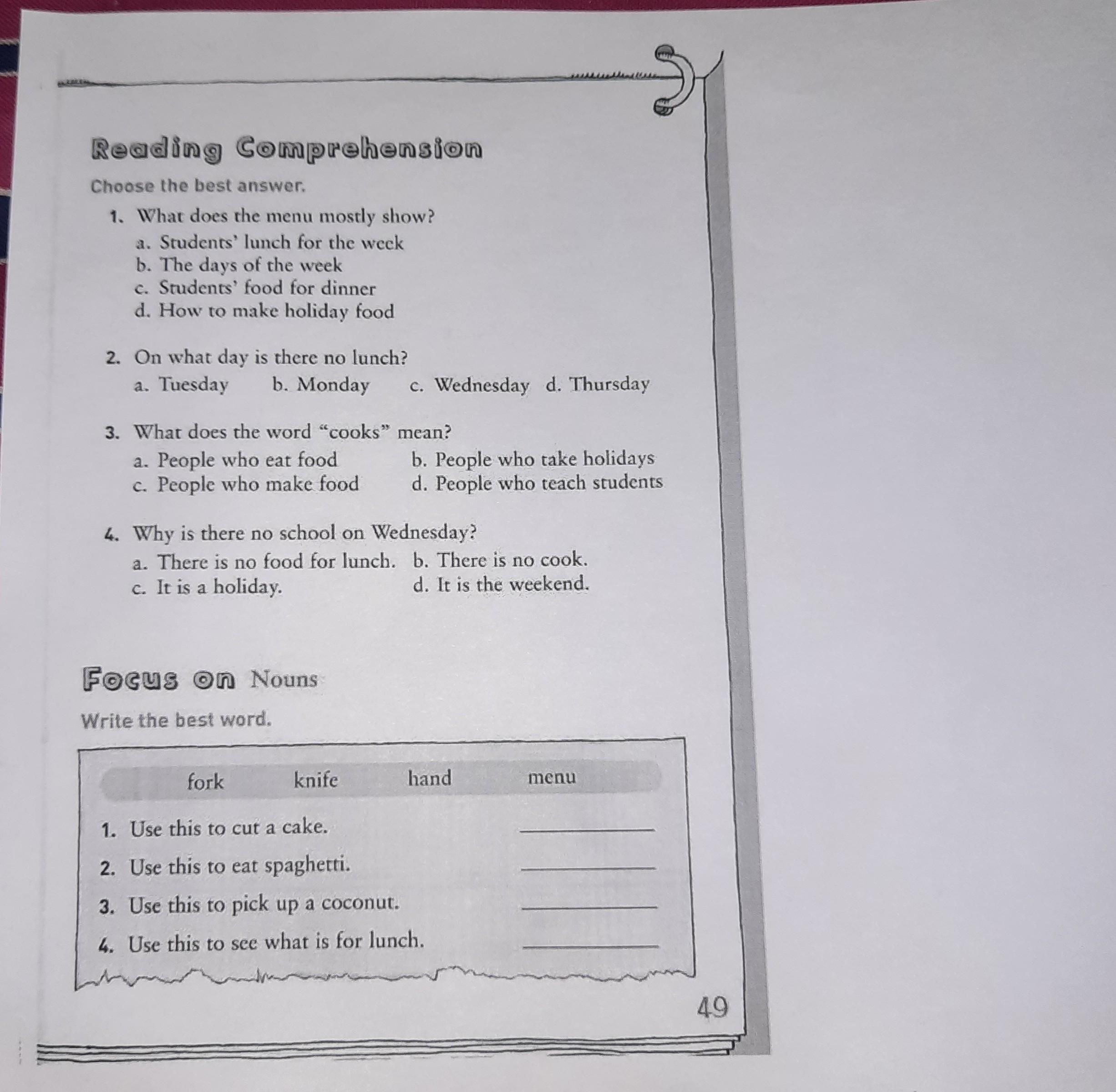 At the start of each week, the cooks at our school make a menu. It shows what the students will eat for lunch each day. Sometimes, the students use a fork and knife to eat their food. Sometimes, they pick up the food with their hands. They look forward to eating lunch each day! But there is no lunch on Wednesday. This Wednesday is a holiday.