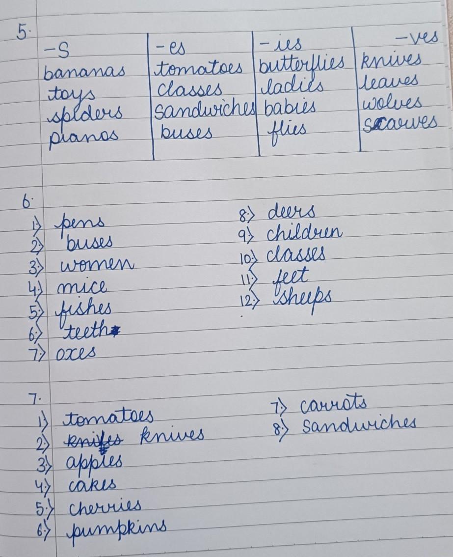 ex5. - S toys, spiders, pianos. - ES tomatoes, classes, sandwiches, buses. - IES butterflies, ladies, babies, flies. - VES knives, leaves, wolves, scarves.