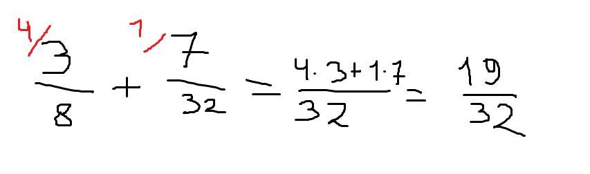 3/8 + 7/32 = (3*4)/(8*4) + 7/32 = 12/32 + 7/32 = 19/32