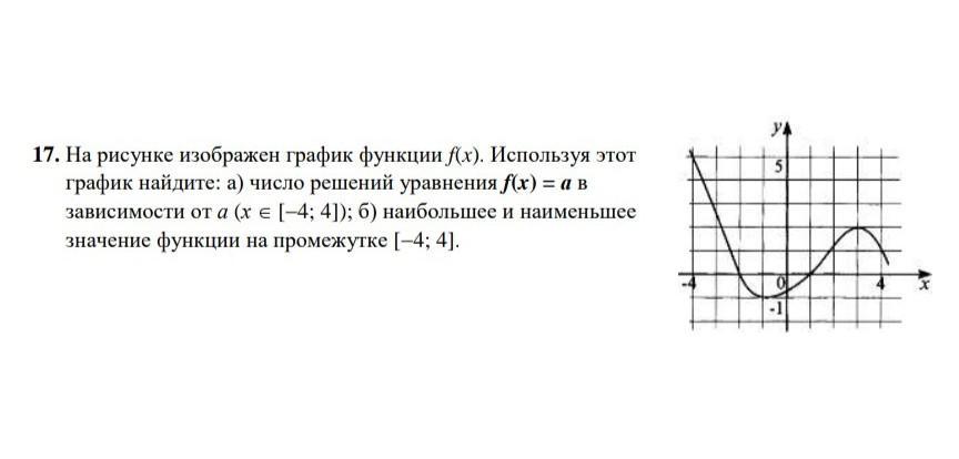 17. На рисунке изображен график функции f(x). Используя этот график найдите: а) число решений уравнения f(x) = а в зависимости от а (x ∈ [-4; 4]); б) наибольшее и наименьшее значение функции на промежутке [-4; 4]. А УА 5