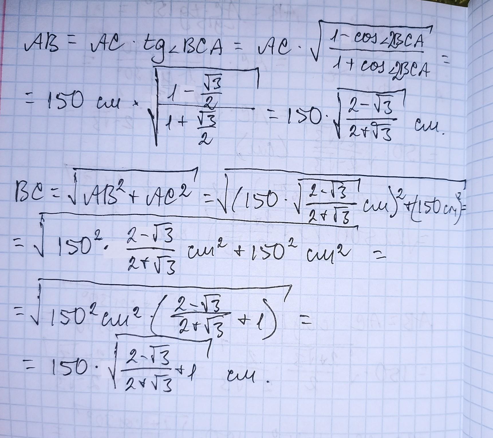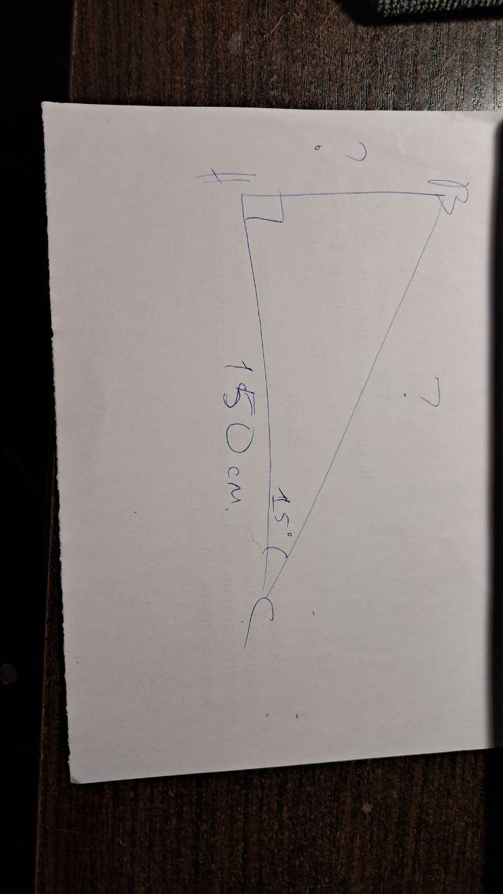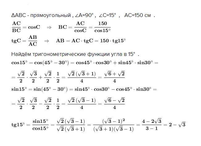 У прямокутного трикутника сторона АС дорівнює 150 см. кут С дрівнює 15 градусів. Знайдіть дві інші сторони цього трикутника, СРОЧНО. ДАЮ 40 БАЛІВ. ДУЖЕ ТРЕБА