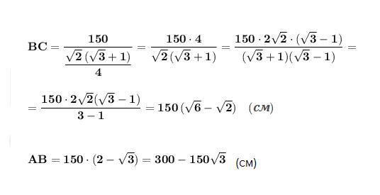 ΔABC - прямоугольный , ∠А=90° , ∠С=15° , АС=150 см .