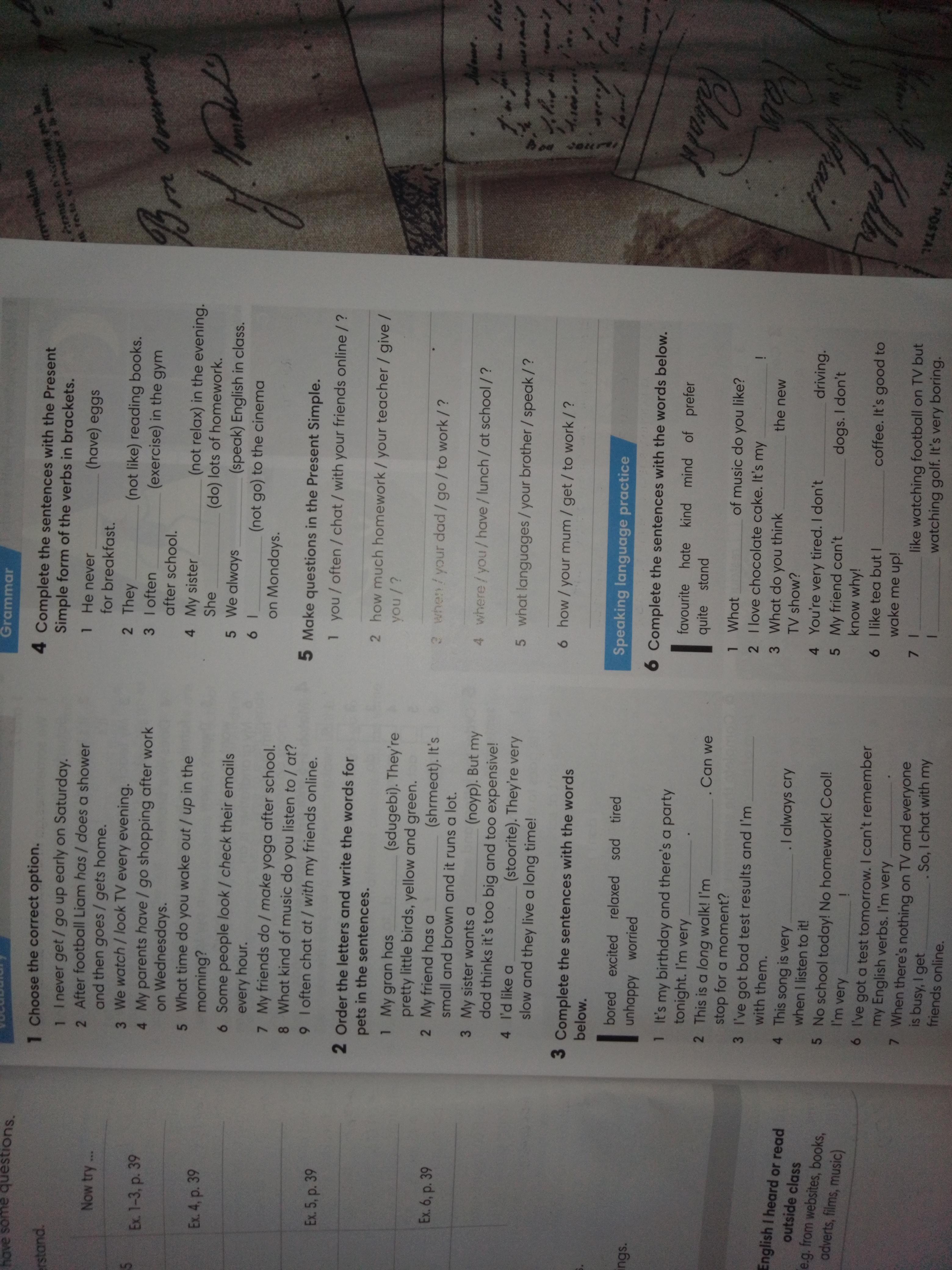 ex 4. 1. He never has 2. They don't like 3. I often exercise 4. My sister doesn't relax in the evening. She does lots of homework. 5. We always speak English in class. 6. I don't go to the cinema on Mondays. Ex 5. 1. Do you often chat with your friends online? 3. When does your dad go to work? 4. Where do you have lunch at school? 2. How much homework does your teacher give you? 5. What languages does your brother speak? 6. How does your mum get to work?