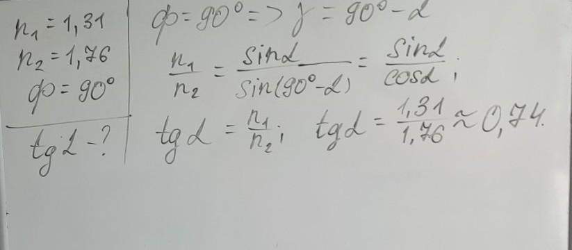 20 баллов!!! луч переходит из среды с абсолютным показателем преломления n1= 1.31 в среду, абсолютной показатель преломления которой n2=1.76. определите тангенс угла падения луча на границу раздела этих сред, если угол между отраженными и преломленными лучами ф=90 градусов.