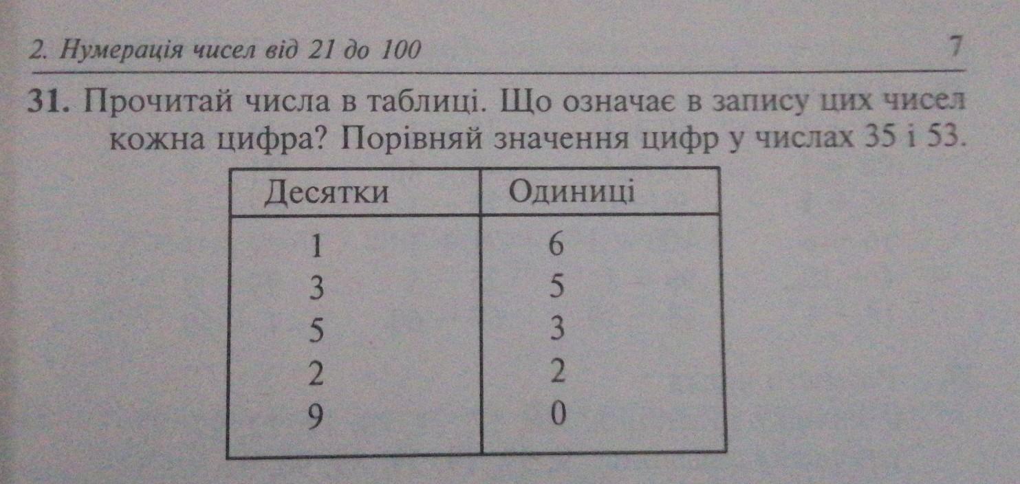 31. Прочитай числа в таблиці. Що означає в запису цих чисел кожна цифра? Порівняй значення цифр у числах 35 і 53.