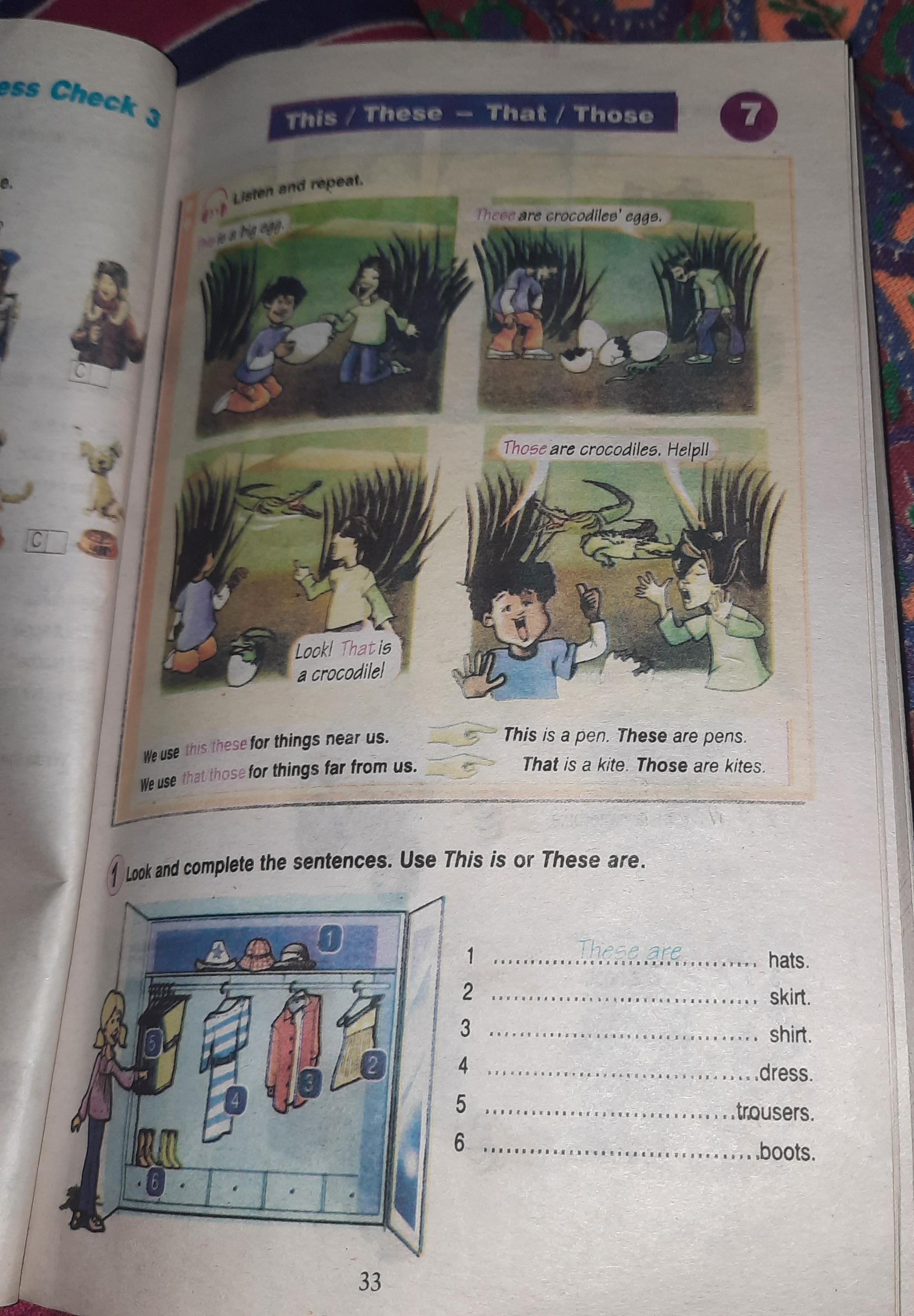 1. There are three hats. 2. There is one skirt. 3. There is one shirt 4. There is one dress. 6. There are two pairs of boots.