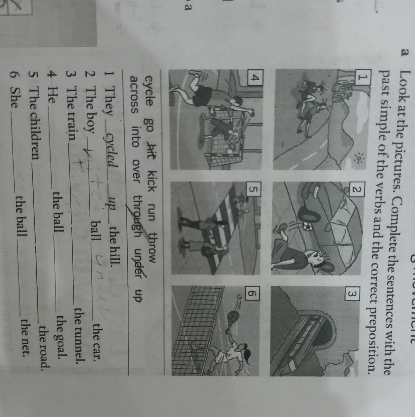 1 They cycled V 2 The boy 3 The train 4 He 5 The children 6 She up the hill. ball n the ball the ball the car. the tunnel. the goal. the road. the net.