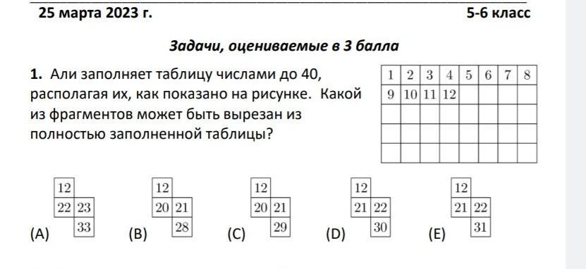 1. Али заполняет таблицу числами до 40, располагая их, как показано на рисунке. Какой ИЗ ФРАГМентов может быть вырезан из полностью заполненной таблицы? (A) 12 22 23 33 (B) Задачи, оцениваемые в 3 балла 12 AS 20 21 28 (C) 12 85 20 21 29 (D) 1 2 3 4 5 6 7 8 9 10 11 12 12 21 22 30 (E) 12 21 22 31
