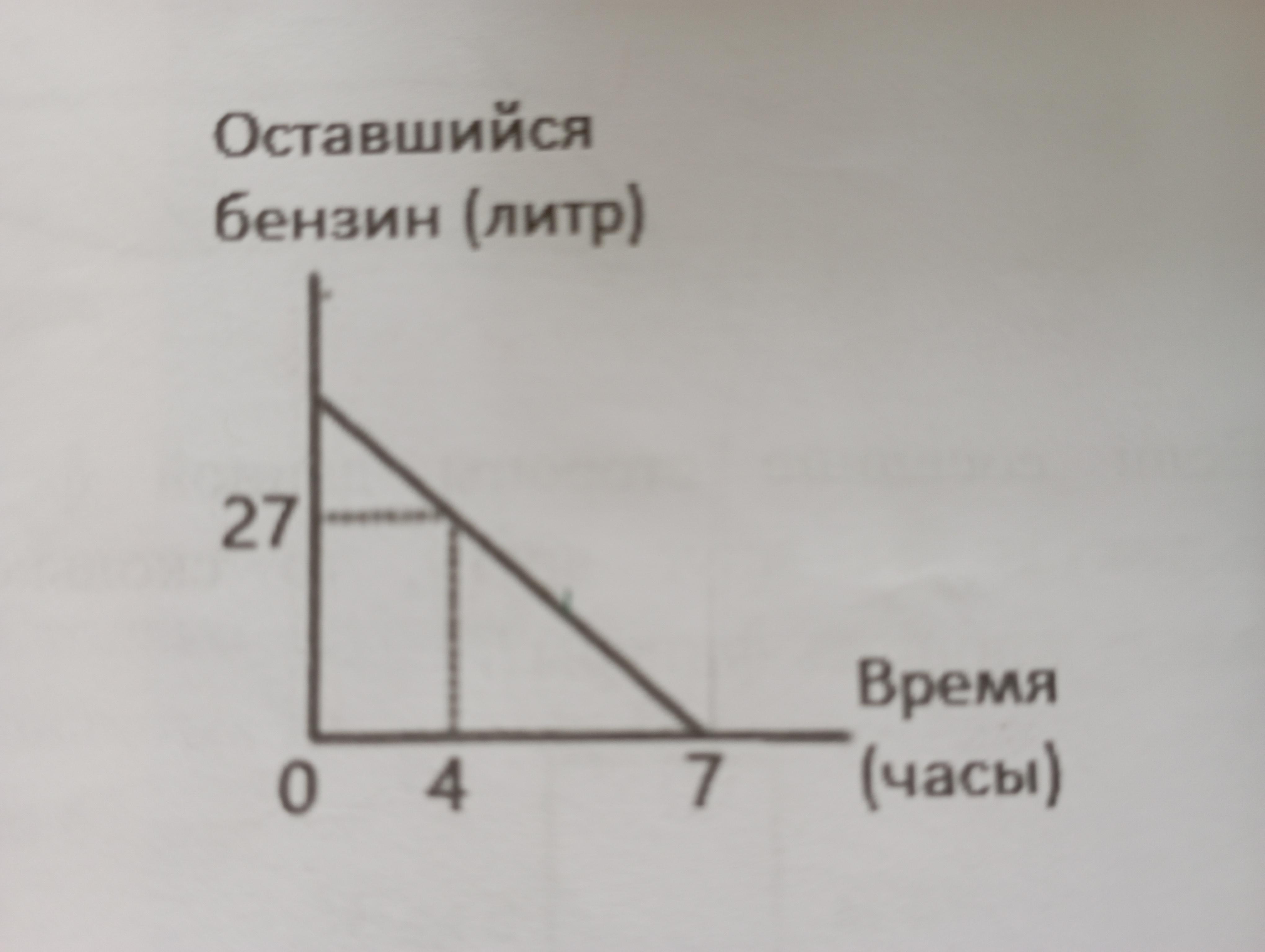 На графике показана зависимость количества бензина,которое остаётся в бензобаке машины,от времени.Сколько литров бензина было в бензобаке,когда машина только начала движение?