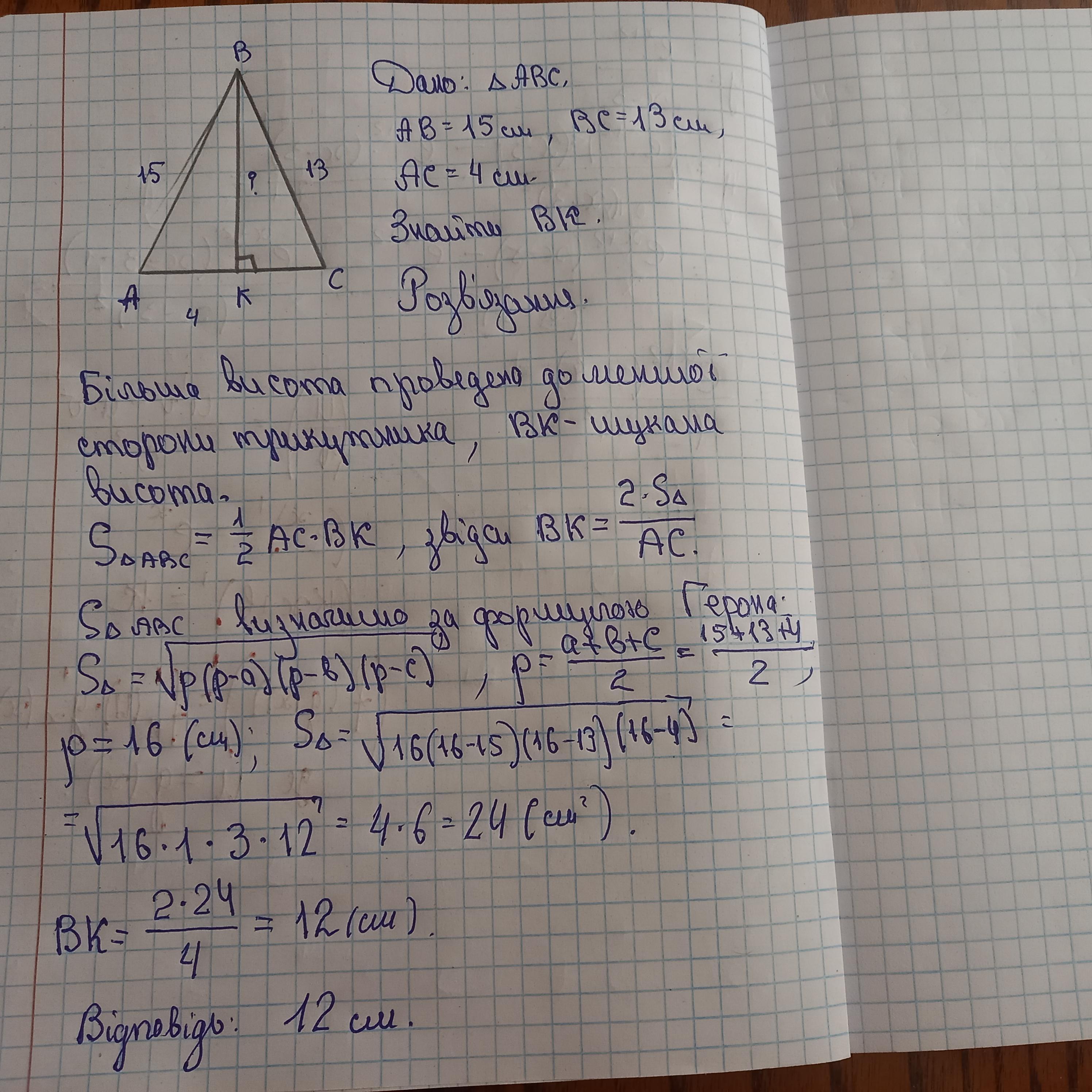 знайти більшу висоту трикутника якщо цого сторони 4,13 та 15 см. срочно з малюнком та пояснення.