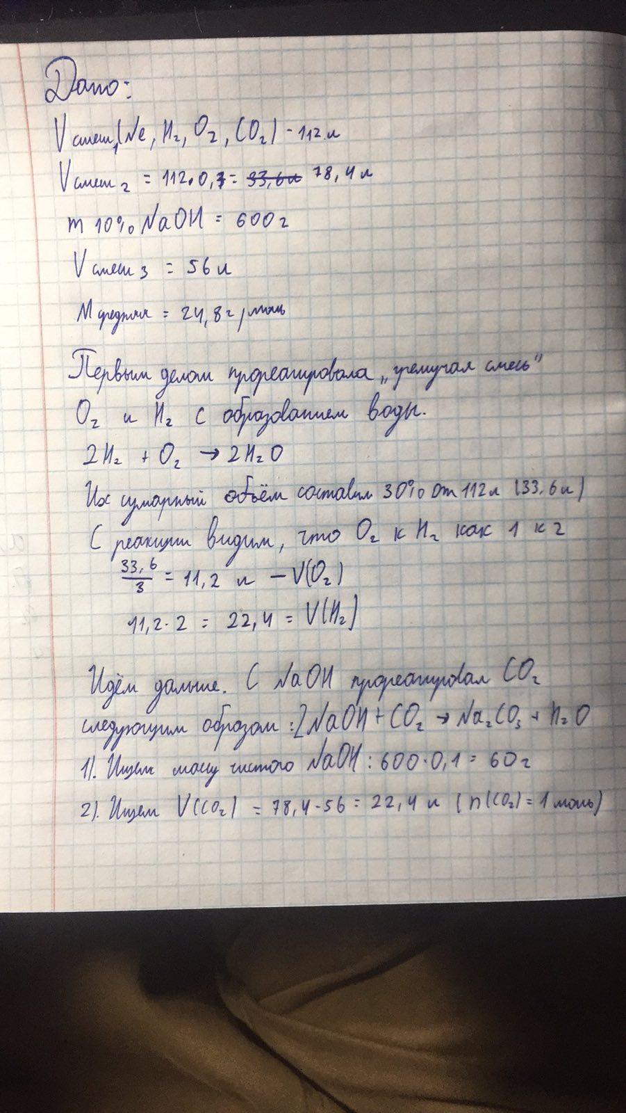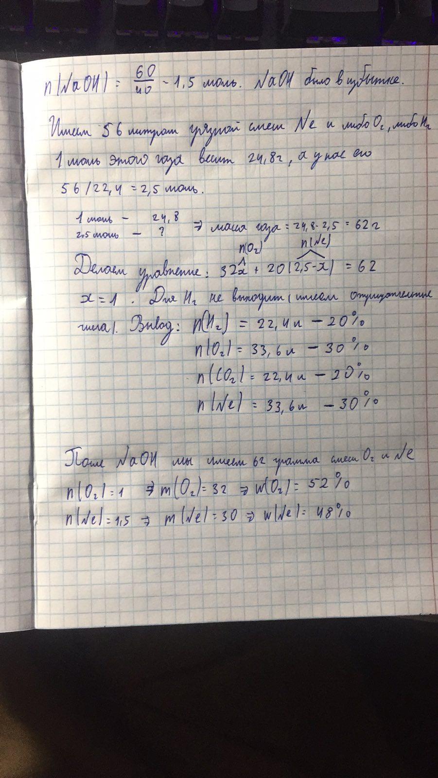 1. Газоподібну суміш, яка містить неон, водень, кисень та вуглекислий газ об'ємом 112 л (н.у.) підпалили, а після завершення усіх реакцій охолодили до 0°С. Внаслідок цього її об'єм зменшився на 30%. Після пропускання залишку через 600 г 10%-го розчину NaOH об'єм суміші скоротився до 56 л. Подальше пропускання крізь заново приготований розчин лугу не призводить до зміни об'єму. Середня молярна маса кінцевої суміші склала 24,8 г/моль.