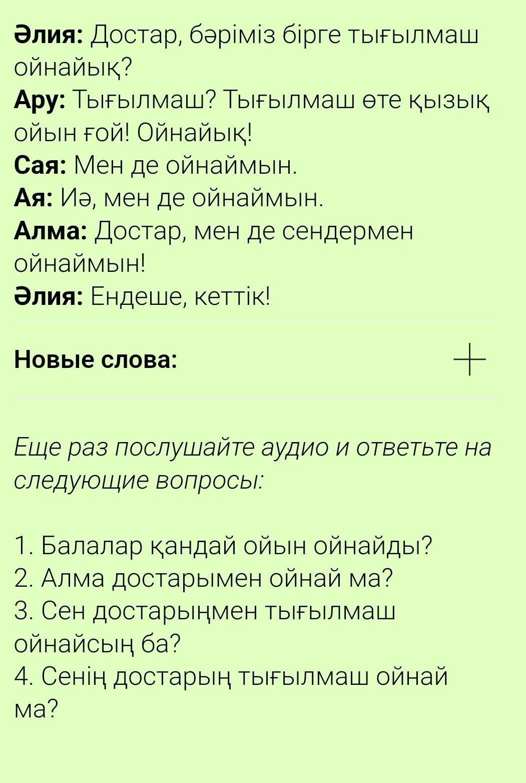 Әлия: Достар, бәріміз бірге тығылмаш ойнайық? Ару: Тығылмаш? Тығылмаш өте қызық ойын ғой! Ойнайық! Сая: Мен де ойнаймын. Ая: Иә, мен де ойнаймын. Алма: Достар, мен де сендермен ойнаймын! Әлия: Ендеше, кеттік! Новые слова: + Еще раз послушайте аудио и ответьте на следующие вопросы: 1. Балалар қандай ойын ойнайды? 2. Алма достарымен ойнай ма? 3. Сен достарыңмен тығылмаш ойнайсың ба? 4. Сенің достарың тығылмаш ойнай ма?