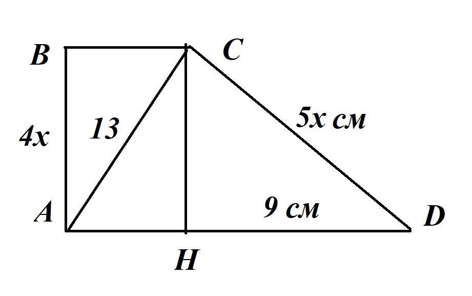 Різниця основ прямокутної трапеції дорівнює 9 см, а їїбічні сторони відносяться як 4:5. Знайдіть площу трапеції,якщо її менша діагональ дорівнює 13 см.