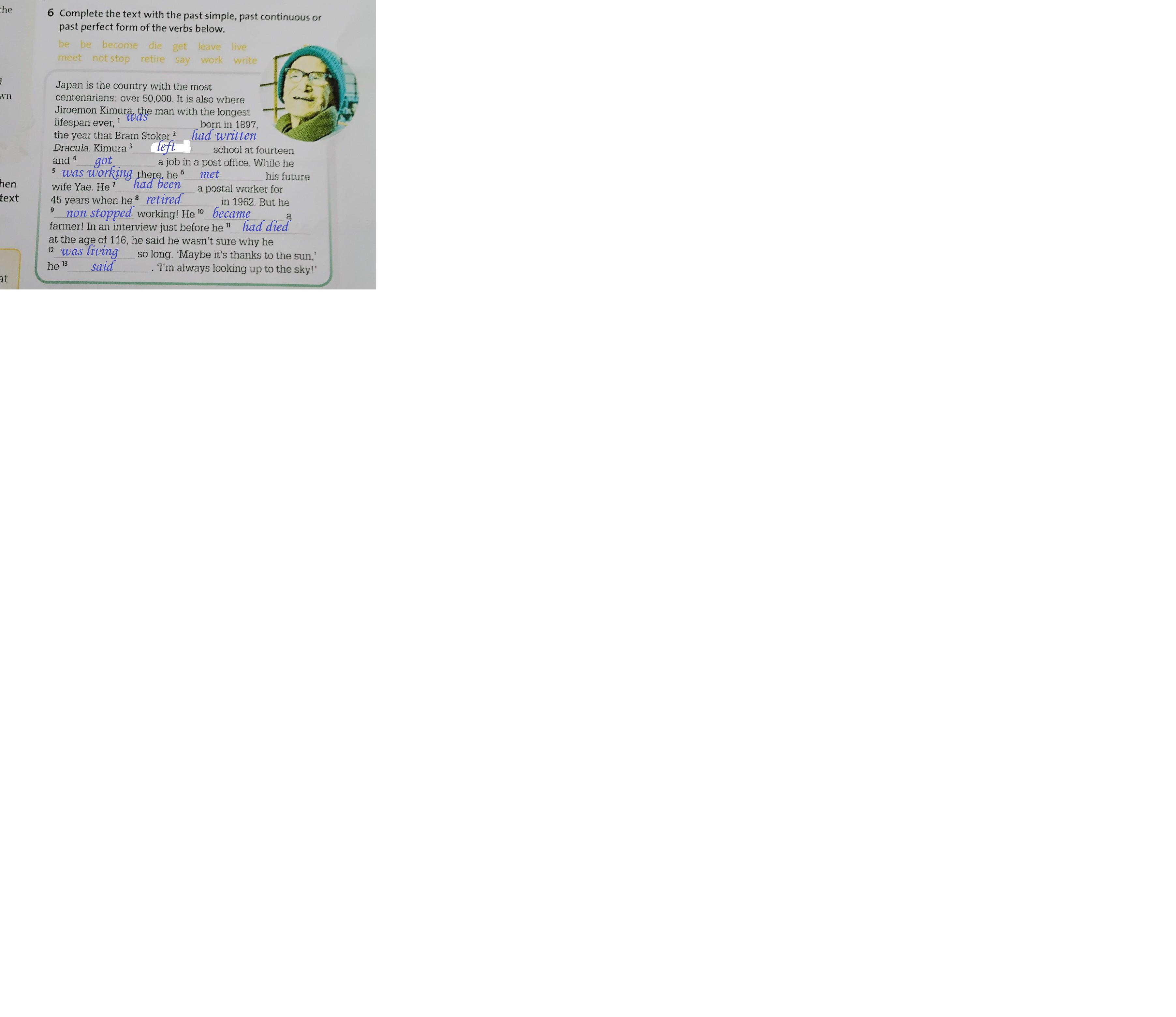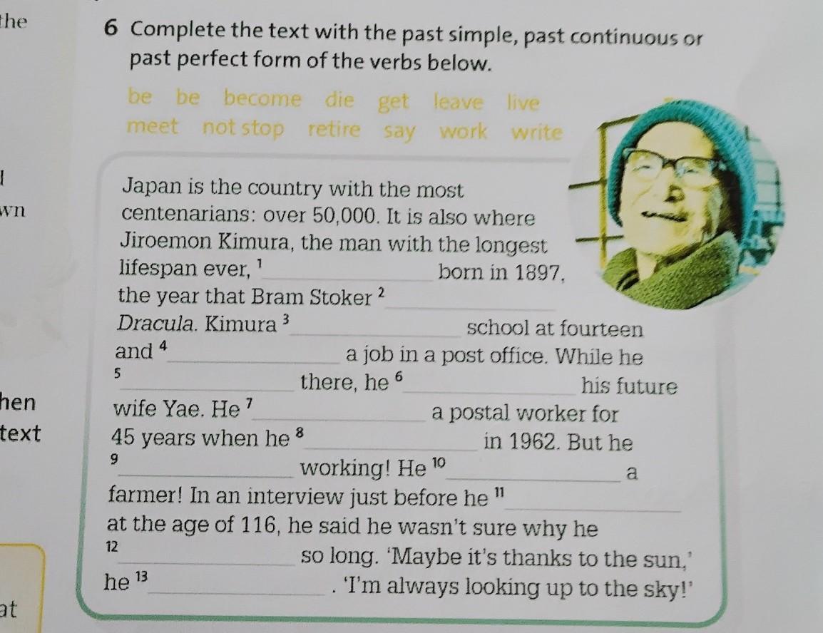 6 Complete the text with the past simple, past continuous or past perfect form of the verbs below. be be become die get leave live meet not stop retire say work write Japan is the country with the most centenarians: over 50,000. It is also where Jiroemon Kimura, the man with the longest lifespan ever, 1 born in 1897, the year that Bram Stoker 2 Dracula. Kimura ³ and 4 5 wife Yae. He' 45 years when he 8 9 he 13 school at fourteen a job in a post office. While he there, he 6 7 Choose a real his future working! He 10 farmer! In an interview just before he " at the age of 116, he said he wasn't sure why he 12 a postal worker for in 1962. But he a so long. 'Maybe it's thanks to the sun,' I'm always looking up to the sky!' СРОЧНООО! ДАЮ 100 БАЛОВ