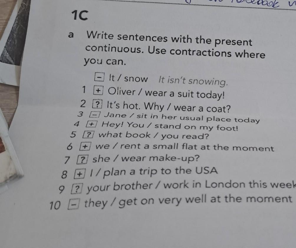1C Write sentences with the present continuous. Use contractions where you can. 1 2 4 6 3 5 7 It / snow It isn't snowing, Oliver / wear a suit today! ? It's hot. Why / wear a coat? Jane / sit in her usual place today Hey! You / stand on my foot! ? what book / you read? we/ rent a small flat at the moment ? she / wear make-up? 8 1/plan a trip to the USA 9? your brother / work in London this week? 10 they/get on very well at the moment b