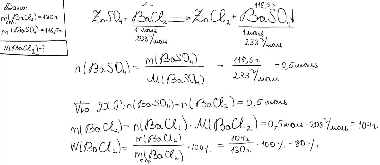 При действии избытка раствора цинкового купороса на 130 г хлористого бария образовался осадок массой 116,5 г. Вычислите массовую долю (%) чистого вещества в указанном веществе. (Запишите число с точностью до десятых.)