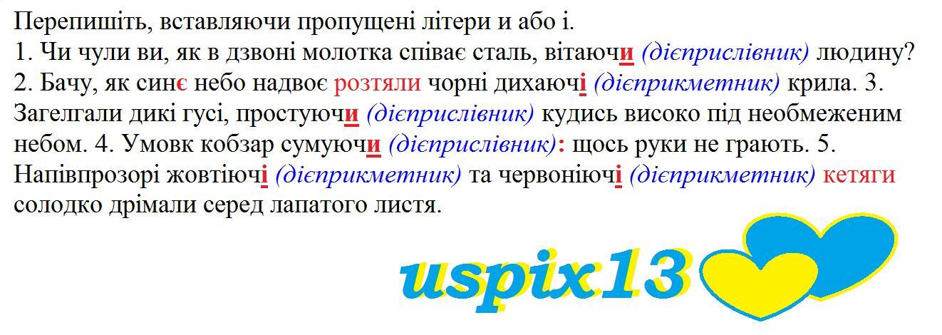 Перепишіть, вставляючи пропущені літери и або і. 1. Чи чули ви, як в дзвоні молотка співає сталь, вітаюч., людину? 2. Бачу, як сине небо надвоє чорні дихаюч., крила. 3. Загелгали дикі гусі, простуюч.. кудись високо під необмеженим небом. 4. Умовк кобзар сумуюч... щось руки не грають. 5. Напівпрозорі жовтіюч, та червоніюч солодко дрімали серед лапатого листя.