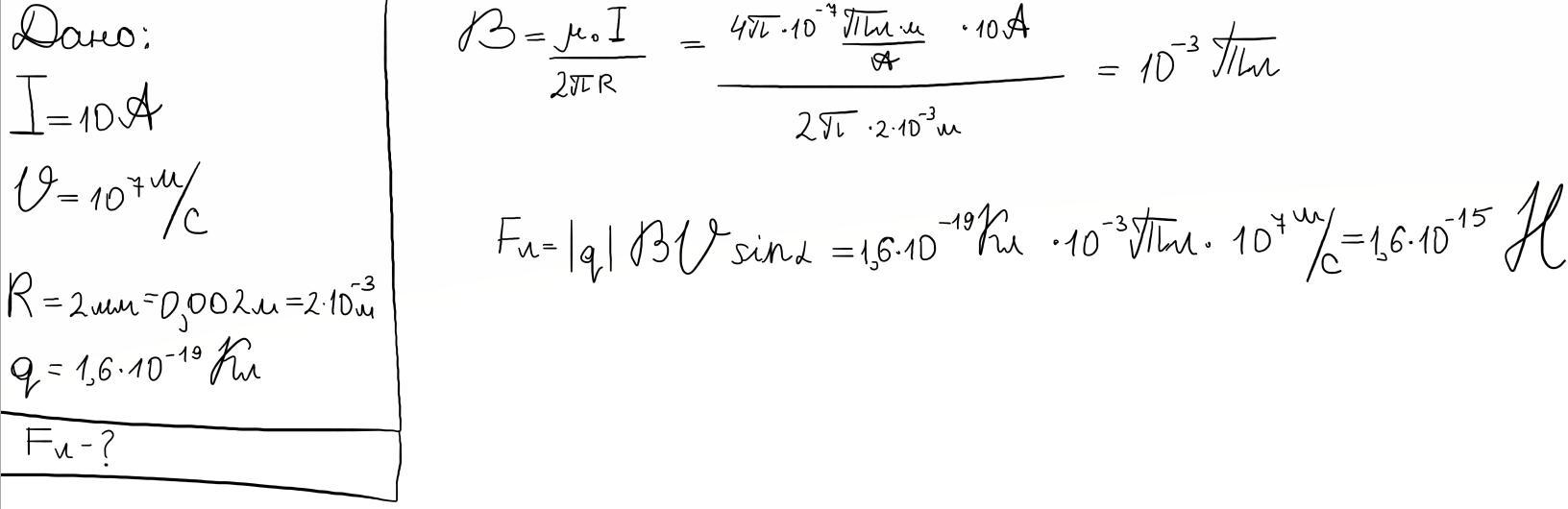 По длинному прямому проводу течет ток силой 10 А. Электрон движется со скоростью 10^7 м/с на расстоянии 2 мм от этого проводника. Насколько сильно магнитное поле тока в проводнике влияет на электрон?